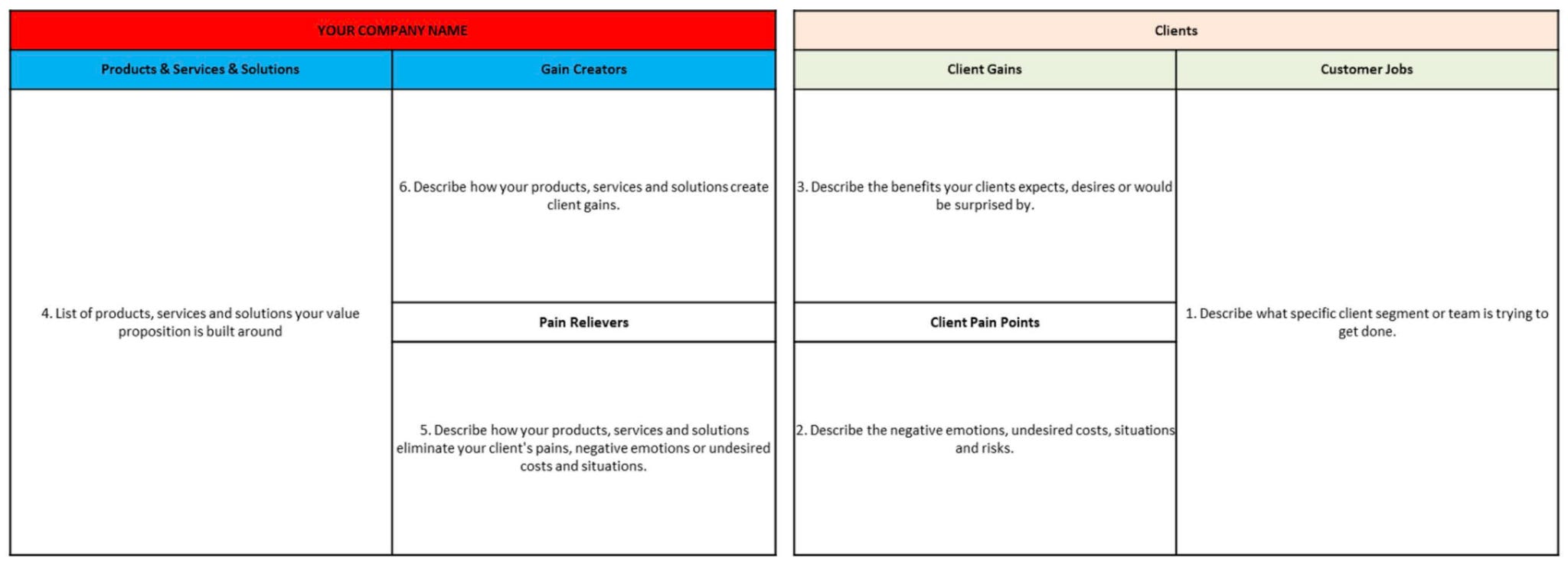 Start with the right-hand side client jobs (1), pains (2), and gains (3), and then focus on the left-hand side, i.e., your company’s solutions (4), pain relievers (5), and gain creators (6).