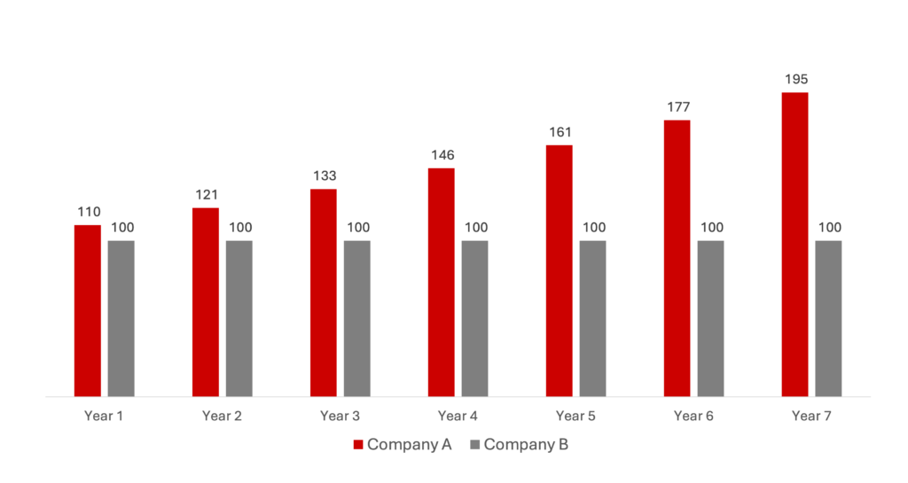 If we extrapolate this over 7 years, company A will nearly double in size, whilst company B will see no actual growth